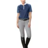 Ladies low rise euroseat breeches have a 1.5 inch waistband and front zip with 2-button closure. One button is on a hidden tab inside the waistband. The Nilo Knee Patch Breech has functional hand pockets in front and faux pockets in back with embellishment. The Animo Italian Style fabric inset at the left hip and enamel signature button in front adds quiet branding that doesn’t distract in the show arena.