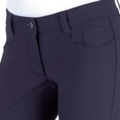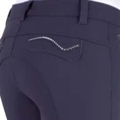 Animo Noodwill Knee Grip Breeches in dark blue Ombra are a ladies euroseat breech with silicone grip knees and elegant crystal trim at the back pockets. Women’s luxury riding breeches are a performance stretch material that wicks perspiration, dries quickly, and has excellent shape retention for a fit that flatters. Animo knee patch breeches are made in Italy and designed for the serious rider who wants comfort, performance, and sophisticated style.