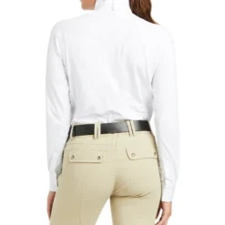 Ariat Auburn Show Shirt is an instant classic for women who need English riding apparel with versatility and cutting edge performance. The women’s Auburn Show Shirt is a long sleeve wrap collar shirt with more technology than seems possible. Ariat delivers with style, too! The Auburn is elegant and correct for any show arena.