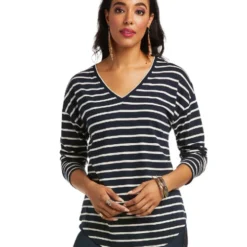 Knoxville Stripe Top from Ariat has long sleeves with a dropped shoulder, a v-neck, and rounded hemline that give it feminine appeal. The soft, easy feel of of the stretch cotton/modal fabric makes this top even better. The Ariat Knoxville Stripe Long Sleeve Top can add a dressy look to favorite jeans while giving you the comfort of a nice soft tee.