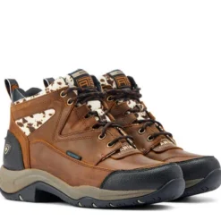 Ariat Terrain Waterproof Boot for women has just a bit of fun cow print at the ankle and tongue to add classic ranch style to these comfortable, durable barn boots. Perfect for wet, muddy conditions, the Ariat Terrain Waterproof Boot is designed for outdoorsy women who have things to do! The Waterproof Ladies Terrain Boot features an oiled full grain leather upper and waterproof membrane to keep your feet dry.