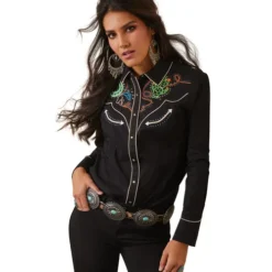 Ladies Wynette Shirt from Ariat is classic black with cream colored piping and smile pockets. The back yoke is edged with piping and embroidered arrow points to match the smile pockets. Clear and turquoise crystals and crystal snaps make the Wynette Shirt sparkle in the lights. Charming embroidery in front and back includes a cactus, horseshoe, horse head, rose, rope, and stars. Ariat Wynette Cactus Yoke Snap Shirt is a beauty and is all-cotton for year-round comfort.
