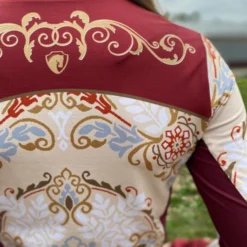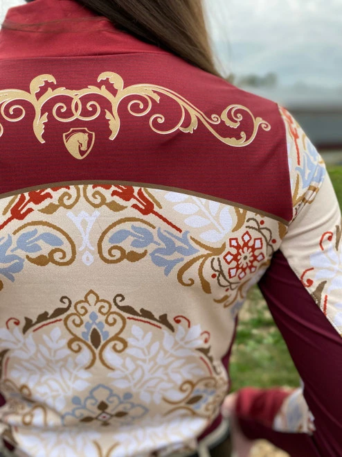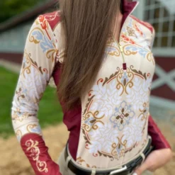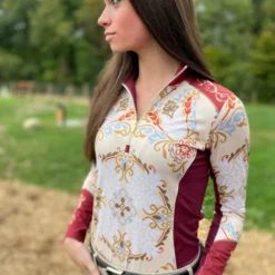 Arista Catori Quarter Zip Shirt has a lush print with stylish details plus smooth, stretchy polyester fabric for multi-season wear. The new Catori style has cowgirl charm with a printed Western yoke and cuffs with fancy design. The fun print is a nice blend of rugged West and sophistication, with a look and comfortable feel that works for any rider.
