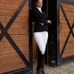 Arista Competition Jacket has distinctive white piping accents and lining that adds a dash of flair over fences. Wash-and-wear tech fabric makes long show seasons a little easier to manage. Sporty and flattering, the Arista Competition Jacket is geared for comfort as well as performance.