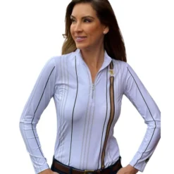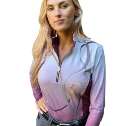 Arista Charmed Equestrian Quarter Zip, Flowing Quarter Zip and Girth II Quarter Zip deliver UPF 50 sun protection.The high spandex content of the Brio-Tek fabric ensures complete range of motion. Arista Equestrian long sleeve riding shirts for women are treated with an eco-friendly antimicrobial finish to help keep odors from forming. Metallic piping on the flattering panels plus an Arista Equestrian printed logo at the chest add to the high end look. These Equestrian Prints Quarter Zips are from the Arista Equestrian Elan Collection.