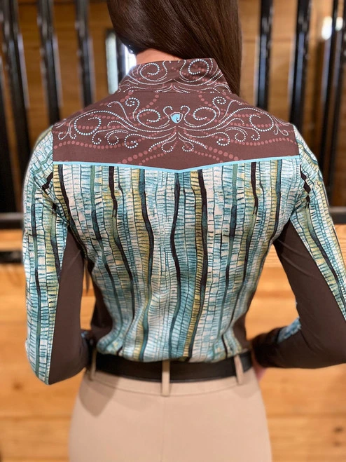 Arista Saguaro Quarter Zip Shirt is a fresh new style from Arista Equestrian with elegant Western flair. Women’s long sleeve UV sun shirt has a dreamy print plus printed brown Western yoke and shotgun cuffs with fancy flourish pattern on both. The fun printed design looks cute whether you’re sitting in a jump saddle or a trail saddle, with breeches, tights, or jeans.