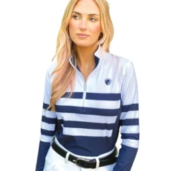 The elegant and sporty Arista Triple Bar Quarter Zip is a striking white and navy or champagne/rustica combination that is designed to flatter. The UV sun shirt has a 9″ zipper and a chic Arista logo at the chest. Enjoy the luxurious soft feel of this practical base layer and its superior athletic performance. The Triple Bar Quarter Zip is from the Arista Equestrian Elan Collection.