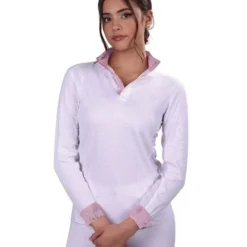 Aubrion Equestrian Long Sleeve Show Shirt has the traditional look you love with all the cool, breathable comfort you appreciate while competing. The women’s long sleeve white horse show shirt has a hidden snap quarter placket and hidden snap wrap show collar. The collar and cuffs are lined with a pretty Moon Star print fabric. Aubrion Equestrian Style Show Shirt looks polished and tidy and feels cool and lightweight.