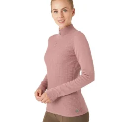 B Vertigo Ruth 1/4 Zip Sweater in cable knit and flat knit is lightweight, breathable, and comfortable for riding. The yarn blend is merino wool and acrylic so you get the performance features plus easy care. Classic neutrals Shiitake, Old Rose Pink, and Dark Blue will look good always!