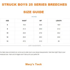 The Struck Boys 25 Series Breech has a grip knee patch system for a secure yet flexible feel in the saddle. Traditional styling includes angled pockets in front, faux flap pockets in back, and euroseat seam. The lower leg has a comfortable stretch panel to create a custom fit under tall boots. Children’s knee patch breech from Struck Apparel accommodates favorite riding belts thanks to the wide belt loops. The waistband is lined with an elasticated band that helps keep show shirts tucked in. Struck Boys 25 Series Breeches are versatile knee patch breeches for schooling, clinics, and competition.