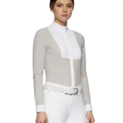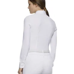 Feminine and sophisticated Cavalleria Toscana Crochet Bib Long Sleeve Competition Shirt has all the technical elements for equestrian comfort. The pretty stretch crochet bib is a unique look that also allows air ventilation. The white poplin straight wrap collar, covered covered placket, and button cuffs ensure the classic show ring look. Women will appreciate the flattering seams and high tech stretch jersey that is soft and smooth.