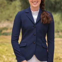 Cavalleria Toscana Knit Collar Riding Jacket has upscale CT style with a distinctive rib knit trim under the collar. Women’s 3-button hunter jumper show jacket boasts Italian design and luxury performance fabrics. Structured soft shell questrian hunt coat is impeccably tailored to create a flattering silhouette and athletic comfort. Cavalleria Toscana riding jacket has angled functional flap pockets plus a decorative pocket flap on the left. Impressive show jacket for competitive equestrians with wonderful detail and notable style.