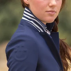 Women’s 3-button CT jacket is a structured soft shell that’s lined at the shoulders and sleeves. A special lining along the front helps the Knit Collar Riding Jacket maintain a flat appearance. There’s a double back vent, feminine shaping, and fully finished interior seams. Lovely black shiny CT buttons at the front plus smaller matching ones at the cuffs add to the custom look. A raised padded stitched CT logo on the right sleeve is the finishing touch. The moisture wicking quick drying technical fabric offers breathable comfort, antibacterial freshness, and UV protection. Enjoy the professional look and feel of the Cavalleria Toscana Knit Collar Riding Jacket in the ring, then turn up the collar to show off the striped knit lining. Very chic!