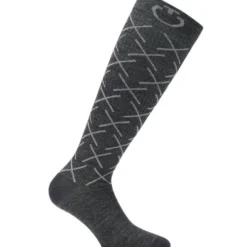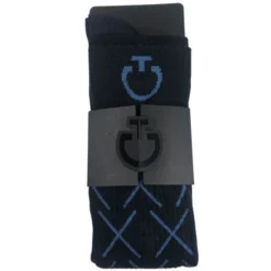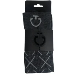 Cavalleria Toscana Wool Socks With Logo are warm yet lightweight with a technical yarn blend that wicks moisture and dries quickly. Soft and stretchy tall boot socks from Cavalleria Toscana are available in Black, Grey, and Navy with an all-over X pattern and CT logo at the cuff.