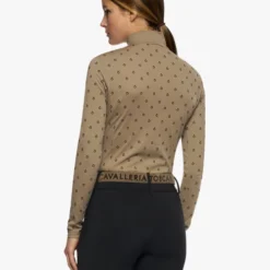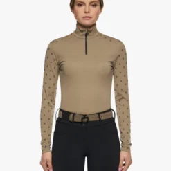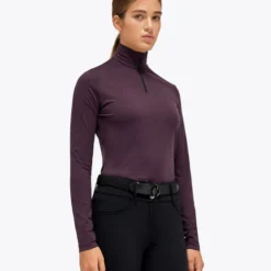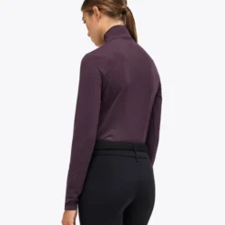 The soft technical fabric is breathable, wicking, and quick drying. The CT Mini Flock Quarter Zip Top helps maintain warmth without being heavy or bulky. Wear it for its excellent athletic features while training or exercising then enjoy it as beautiful leisure wear to double its wardrobe value. Ladies cold weather horseback riding top has a quarter zip closure with signature CT logo pull. The lovely Dark Purple and Brown colors both have black accent trim. The Cavalleria Toscana Mini Flock CT Print Quarter Zip Top is the perfect chic base layer to add to your winter equestrian outfits.