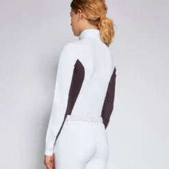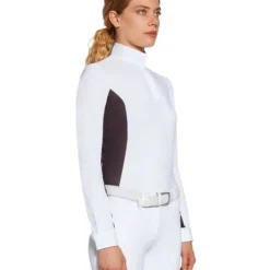 Cavalleria Toscana Jersey Perforated Insert Long Sleeve Shirt is a silky stretch jersey show shirt with sophisticated style. Women’s long sleeve white show shirt has contrast color perforated inserts on the sides and inner sleeves for cooling and distinctive style. Technical jersey offers perfect flexibility for riding. The clean covered placket and straight edge wrap collar with tonal CT embroidery gives the Perforated Insert Hunter Polo a correct look for hunter jumper competition.