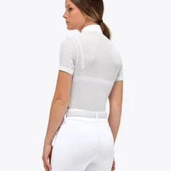 Ladies Cavalleria Toscana Pique Mesh Short Sleeve Polo is elegant and sporty with the perfect fabrics for summer competition. The premium stretch jersey front is matched with technical pique mesh for the sleeves and back. The Pique Tech Mesh Polo will keep riders poised and cool on the hottest days. The white poplin show collar with silver/grey CT embroidery ensures a crisp, classic look.