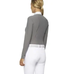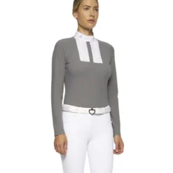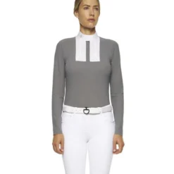 Cavalleria Toscana Poplin Bib Competition Polo is lightweight and stretchy so it tucks into breeches easily and lets riders move comfortably. The white bib has unique envelope seams, a subtle detail that is typical of Cavalleria Toscana fine show apparel. A CT logo is embroidered on the show collar. Tech stretch jersey is super comfortable and designed to keep riders comfortable all day. The Grey long sleeve polo has a grey placket in the center of the white bib. The White long sleeve polo is all-white. Cavalleria Toscana Poplin Bib Competition Long Sleeve Polo is a smart and beautiful choice for serious equestrian competitors.