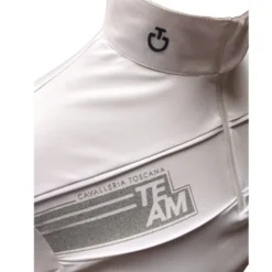 Cavalleria Toscana Team Daytona Short Sleeve Polo brings sporty team style to your equestrian competition wardrobe. Ladies short sleeve show jumping competition shirt is a super silky stretch jersey with moisture wicking, quick drying capability. The outstanding stretch lets you move with ease and keeps its shape. A distinctive lightly flocked CT TEAM Daytona racing logo and piping across the front and back earns extra style points.