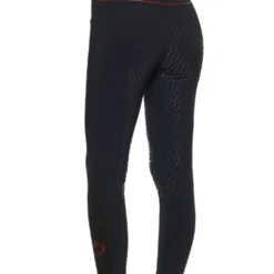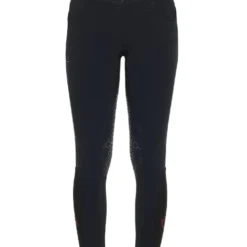 Cavalleria Toscana Team Red Stripe Full Grip Breeches in Navy offer a great fit and technical performance for riding. Women’s dressage schooling breeches are the highest quality four-way stretch jersey and are breathable, wicking, and antibacterial for odor control. These sporty breeches have a red stripe and TEAM print across the back yoke and a red stripe accent on the CT logo on the upper right leg.