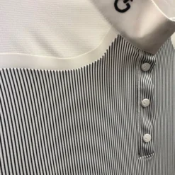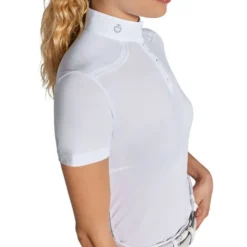 Cavalleria Toscana Tech Piqué Polo Short Sleeve has a quarter length snap placket with white CT snaps and a show collar with CT embroidery. The short sleeve competition shirt has sporty details like the white silicone stripe at the lower edge of the front shoulder panel. Lovely Cavalleria Toscana Tech Piqué Short Sleeve Competition Polo will be a hot weather favorite for showing and clinics.