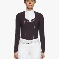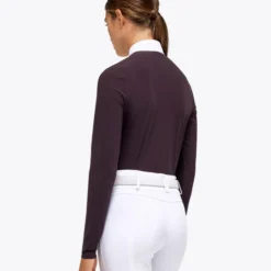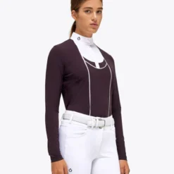 Cavalleria Toscana Tech Pique Show Polo Long Sleeve is a beauty in Dark Purple with crisp white bib and piping. The Cavalleria Toscana competition shirt in breathable jersey offers balanced proportions and great attention to detail. This one delivers extra style with unique white piping that elongates and flatters the figure. The Tech Pique Show Polo is ultra feminine and graceful and has all the athletic performance equestrians need.