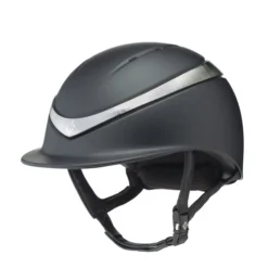 The new Charles Owen halo Helmet with MIPS technology is a stunning look for equestrians who appreciate style as well as superior safety. Charles Owen created this new riding helmet to celebrate their 110th anniversary. They pulled out all the stops to integrate comfort and safety with an elegant, modern design. This Halo MIPS Helmet model has the standard brim with halo ring in black or platinum.