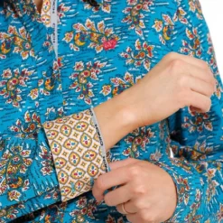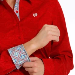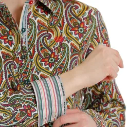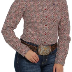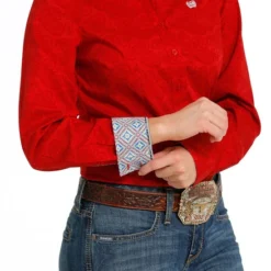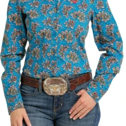 This Cinch Ladies Performance Shirt has a plain front with no pockets for an ultra-clean, crisp profile. The performance cut Western riding shirt has a longer shirt tail and sleeves so you’re always properly covered and comfortable. The all-cotton material has a little bit of give plus a silky feel that will make you think it’s a cotton blend. The prints are beautiful, perfect for horse showing in any season.
