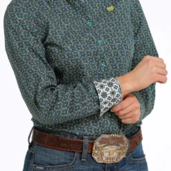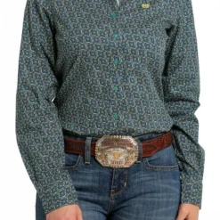 Women’s Cinch Performance Shirt has distinctive prints with contrast print trim on the inside of the collar, inside the cuffs, and the cuff placket. Cinch branded coordinating buttons give it a polished finishing touch. The Cinch Performance Shirt for Western showing and riding has a small embroidered Cinch logo at the chest. The collar is taped so there are no seam edges to irritate. The button front shirt has bust darts plus princess seams in front and back to enhance the feminine shape. Wear your Cinch Performance Shirt at the shows or for clinics or lessons. It always looks sharp!