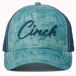 Cinch Tie Dye Trucker Hat in beautiful green and teal shades has a cool summer beach look plus authentic Western style. Casual baseball cap has a smooth poly/cotton front with subtle tie dye print. The front panel features Cinch embroidery in teal with stitched outline.