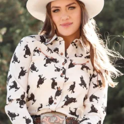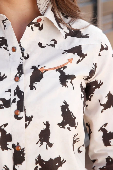 Women’s Cruel Denim Bronc Print Rayon Shirt has long sleeves and traditional cowgirl style in a silky rayon fabric. A light Stone color is the backdrop for the striking bronc rider and horse silhouette print in black.