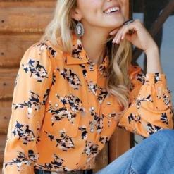 Charming Cruel Denim Horse Print Rayon Shirt looks has classic Western snap shirt elements plus silky rayon fabric for a flattering look and feel. The creamy orange color shirt has a charming horses and scenery print in black, white, grey, and pink.