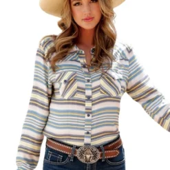 Ladies Cruel Denim Striped Rayon Western Top features lively horizontal stripes plus bias cut yokes and pockets in a great mix of colors. The rounded hem and soft rayon fabric give it a flattering drape and lightweight feel, making it perfect for riding and cowgirl fashion.