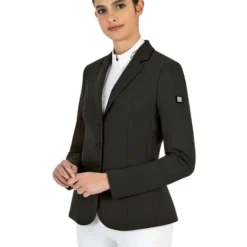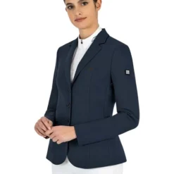 Equiline Celisa C Show Coat with B-MOVE fabric is stretchy, breathable, and controls moisture for all-day confidence. It is machine washable to help you get through long show seasons. Equiline added 100% recycled buttons to the Celisa Competition Coat as part of its ‘Ride into Green’ initiative. Celisa C Show Coat has the great fit that Equiline is known for with sophisticated details. Classic jumping or dressage show coat is elegant yet sporty in black, blue, or chocolate. The subtle piping, Equiline horse heads embroidery at the chest, and emblem on the sleeve are quiet details that add the perfect finishing touches to this high end equestrian apparel.