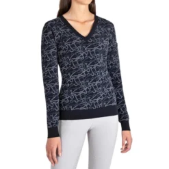Pair the Equiline Engre Jacquard V-Neck Sweater with your favorite riding breeches and jeans for an elegant and timeless look. Ladies medium weight knit sweater features an all-over Equiline horse head logo pattern that creates a unique equestrian look. It has a fine, smooth knit with solid color ribbed neck, hem, and cuffs.