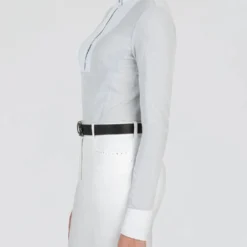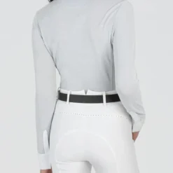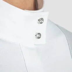 Equiline Women’s Garde G Show Shirt offers elegance with a glamorous edge thanks to silver or white Lurex fabric and crystal button closures on the collar. The breathable stretch fabric is wicking and quick drying to keep horse show competitors comfortable all day.