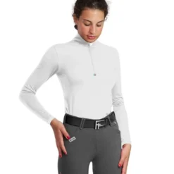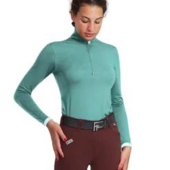 Gioconda Tech Shirt from For Horses is a silky long sleeve UV sun shirt with a luxury feel and beautiful Italian style. Women’s soft, stretchy quarter zip technical riding shirt comes in several colors with patterned linings at collar and cuffs. The highly breathable fabric is wicking, quick drying, and inhibits odors from forming. The durable fabric resists pills and abrasions.