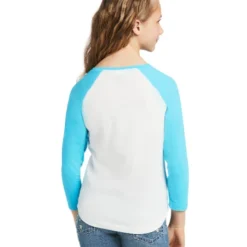 The Ariat Long Live The West Tee is a soft cotton jersey with spandex that is nice and stretchy for all day comfort. The body of the shirt is a creamy Cloud color while the raglan sleeves are a clear deep sky blue. It’s a cute look with riding tights, jeans, and shorts and is perfect for year-round wear. Your girl will want to wear this one all the time thanks to the comfort and timeless Western vibe mixed with fun color.