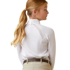 Ariat Sunstopper Pro 2.0 Show Shirt for girls is a lightweight English equestrian show shirt with outstanding stretch and UV skin protection. Kids Ariat Pro Series long sleeve show shirt is ideal for summer days in the hunter/jumper arena. Classic smooth poplin cuffs, wrap collar, and covered quarter length placket ensure a traditional look.