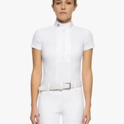 Cavalleria Toscana Short Sleeve Pleated Competition Shirt gives girls the comfort of technical fabric that is lightweight, stretchy, moisture wicking, and fast drying. It keeps odors in check so the shirt stays fresher on long show days. Girls Cavalleria Toscana equestrian show shirt has a slim fit, refined look, and silky feel that’s perfect for young riders who want to look and feel their best while competing.