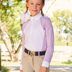 Girls RJ Classics Lexi Show Shirt has a traditional English show shirt look plus tech mesh fabric and super stretchy comfort. When paired with a competition jacket, the Lexi children’s equestrian shirt from RJ Classics will show a white collar, cuffs, and front. Hidden under the jacket will be the amazing breathable stretch mesh fabric in contrast color. The Lexi Show Shirt is everything your young rider wants for competition!