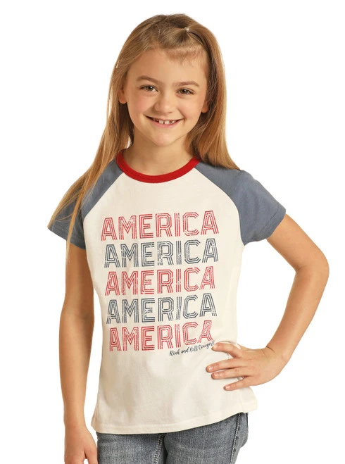 Rock & Roll America Tee for girls is a short sleeve white T-shirt for with cool vintage “America” text in red and blue. Children’s RRCG shirt has a feminine modern rounded neckline with red trim and blue raglan short sleeves for sporty style. Patriotic RRCG America Tee is perfect for patriotic holidays like Independence Day!