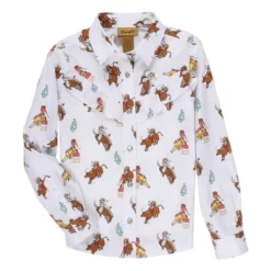 Girls Wrangler Western Riding Shirt has playful and stylish elements with a fun rodeo print and feminine ruffle across the front. The cheerful print has cacti among the girls who are barrel racing, bull riding, and bronc riding. The white fabric is the perfect backdrop for this lively print that celebrates young cowgirls.