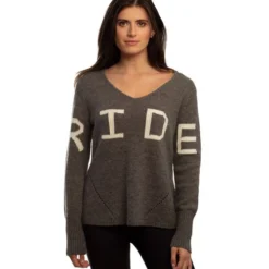 The fall/winter RIDE Sweater from Goode Rider is a soft knit blend that’s warm, cozy, and so easy to layer. The RIDE letters are placed across the sleeves and chest, a unique design that adds to its charm. Women’s casual relaxed fit sweater features a wide v-neck and long ribbed cuffs. Vent stitching at the hip in front and back adds extra visual interest. Pair the Goode Rider RIDE Sweater with breeches, jeans, and tights and express your horse girl style!
