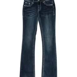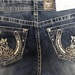 Grace in LA Horseshoe Pocket Jeans are tastefully embellished with small crystals, embroidery, and metallic thread and feature the perfect amount of sanding and whiskers. Ladies bootcut denim jeans have a zip fly and button front with classic 5-pocket styling. The back pockets are a standout with fancy horseshoe design framing a pretty horse head. The 34″ length of the Grace in LA Easy Fit Horseshoe Pocket Jeans make them perfect for wearing with boots or heels.