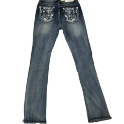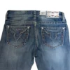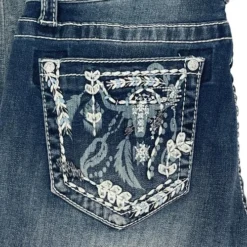 Women’s Western bootcut denim jeans have a classic zip fly and button front and five-pocket styling. The Steer Pocket Jeans from Grace in LA are a darker indigo wash with fading and whiskers. The light blue and cream tones in the design are highlighted with silver thread for a bit of shine. An extra fancy metallic painted tag on the waistband plus fringed hems are the perfect finishing touches. What a great price!