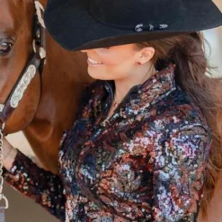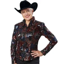 The Ginger Show Jacket from Hobby Horse goes all in for dramatic flair! Ladies Western show jacket is embellished with thousands of pailletes and sequins in ornate patterns. Rich, deep shades of purple, blue, red, green, and black are perfectly blended. The Ginger Jacket is made with Hobby Horse’s special stretch mesh fabric that is breathable, lightweight, and forgiving.