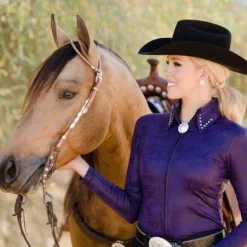 Hobby Horse Jeanee Show Blouse is an elegant and richly colored blouse for your next show. The stretchy but firm show shirt is stylish and practical and on sale at Mary’s! Hobby Horse show blouse has a full zip front and a flattering profile. The fabric has an interesting, low key denim look. The collar points are outlined in silver studs, a sophisticated embellishment that works with the clean, sleek look.