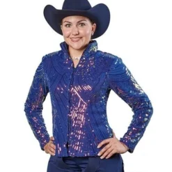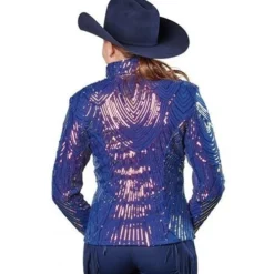 The Luminous Show Jacket by Hobby Horse makes a statement in beautiful Indigo stretch mesh with flashy all-over trim. Iridescent sequins decorate this Western show jacket for dazzling shine while you show. From gold to green, blue, pink, and purple, the sequins change color as you move. Lovely show top makes it easy to mix, match, and accessorize.