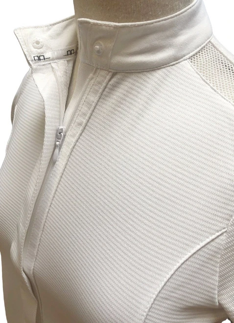 Horseware AA Girls Kara CleanCool Shirt is a long sleeve equestrian show shirt for girls with a modern low profile wrap collar and covered full length zipper. The luxurious hunter jumper show shirt from the Horseware Alessandro Albanese collection is made with a technical fabric called CleanCool. This innovative fabric with silver ion is breathable, wicking, sun protective, and cooling for hot weather competition. It has a slight texture to the soft knit that adds to the high end look.